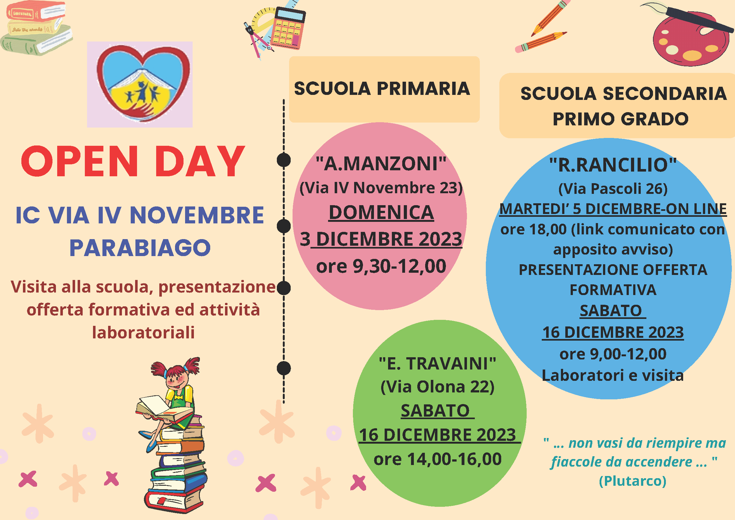 Per avere il link di accesso all'Open Day on line della Scuola Secondaria di primo grado “Rancilio”, che si terrà a mezzo piattaforma TEAMS martedì 5 dicembre p.v. alle ore 18, è necessario inviare una mail al Dirigente Scolastico prof.ssa Antonina MIRABILE al seguente indirizzo: